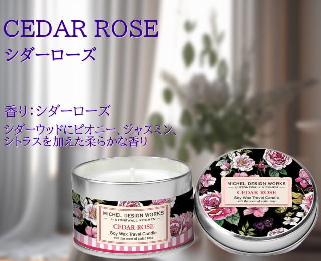 ミッシェルデザインワークスがお届けする、シダーローズの香りが楽しめるトラベルアロマキャンドル。心地よいローズの香りが、リラックスした空間を演出します。旅先でも、いつもの空間でもリラックスしたいときにぴったりのアイテムです。
